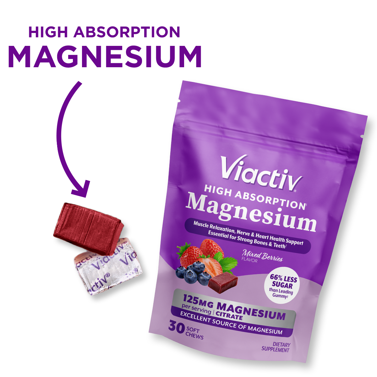 High absorption magnesium citrate in a tasty berry flavored soft chew...they're MAGnificent because they have 2/3 less sugar than the leading gummy brand.